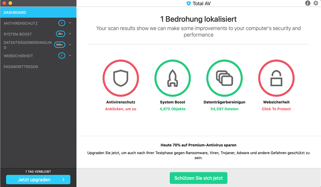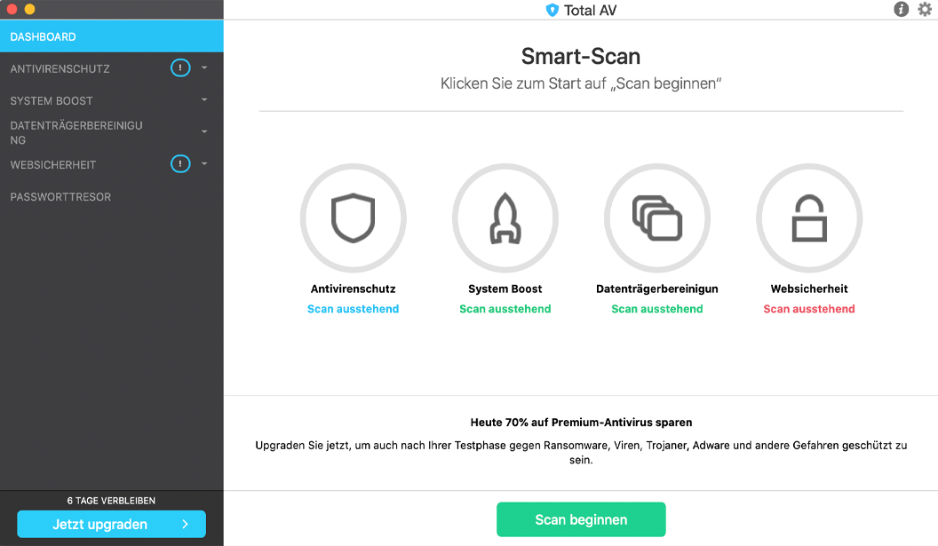 Dank der reibungslosen Performance und der intuitiven Benutzeroberfläche ist die Bedienung eine wahre Freude. Und mit so vielen Funktionen in einem einzigen Paket – vom ausgezeichneten Antivirenschutz bis zu Passwortmanagement, Datenschutz und mehr – könnte TotalAV die einzige Internet-Security-Software werden, die Sie überhaupt brauchen.
